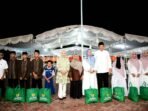 Foto bersama penerima santunan dengan Gubernur Gorontalo Gusnar Ismail, Wagub Idah Syahidah Rusli Habibie, dan Ketua TP PKK Nani Ismail Mokodongan, pada
