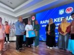 Penyerahan bantuan kepada pelaku UMKM oleh Ketua Dekranasda Provinsi Gorontalo Nani Ismail Mokodongan pada Rapat Kerja Daerah (Rakerda) di Aula Rumah Jabatan