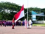 Pengibaran Bendera Merah Putih pada upacara peringatan HGN tingkat Provinsi Gorontalo di lapangan Museum Purbakala, Selasa (25/11/2025). (Foto : Haris) KOTA GORONTALO,
