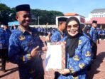 Wakil Gubernur Gorontalo Idah Syahidah Rusli Habibie saat menyerahkan SK Pengangkatan kepada perwakilan PPPK Paruh Waktu dilingkup Pemerintah Provinsi, pada upacara Korpri