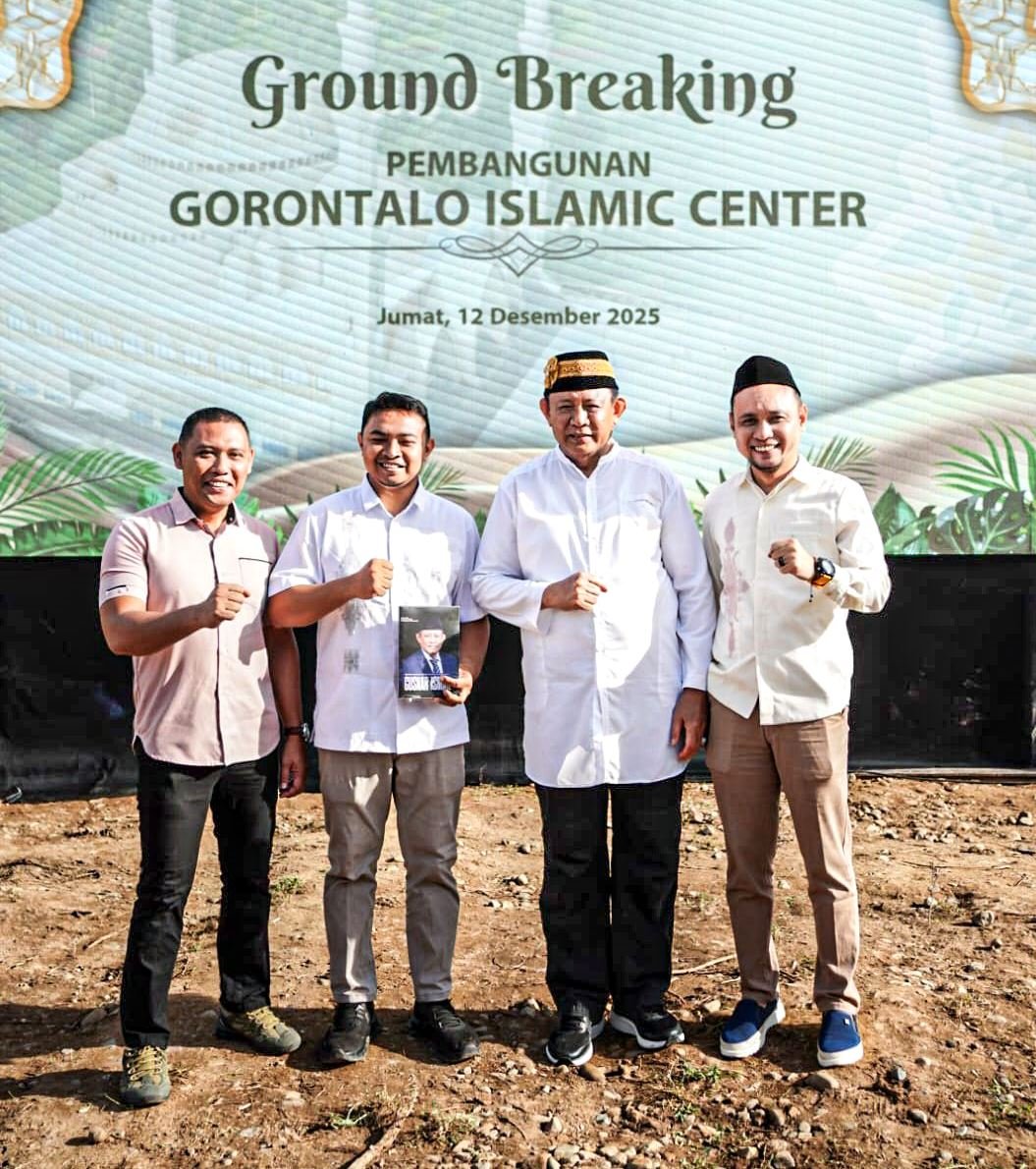 Tiga Juru Bicara berfoto dengan Gubernur Gorontalo Gusnar Ismail (kedua kanan) pada peletakan batu pertama pembangunan Gorontalo Islamic Centre di Kecamatan Tapa, Kabupaten Bone Bolango, Jumat (12/12/2025). (Foto : Timko)