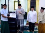 Gubernur Gusnar Ismail menyerahkan bantuan kepada pengurus takmirul usai salat Jumat berjemaah di Masjid Besar At-Tabiin, Kecamatan Bulango Selatan, Kabupaten Bone Bolango,