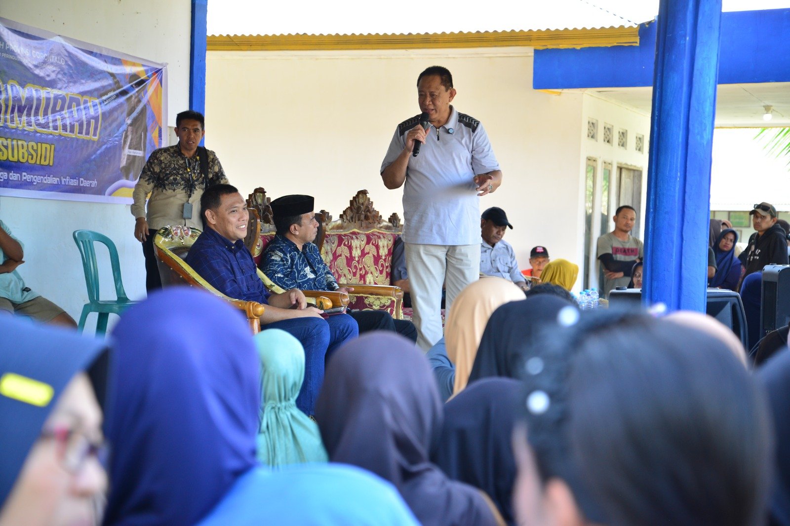 Gubernur Gorontalo Gusnar Ismail saat memberikan sambutan pada pasar murah di Desa Isimu Selatan, Kecamatan Tibawa, Kabupaten Gorontalo, Minggu (2/11/2025). (Foto : Mila)
