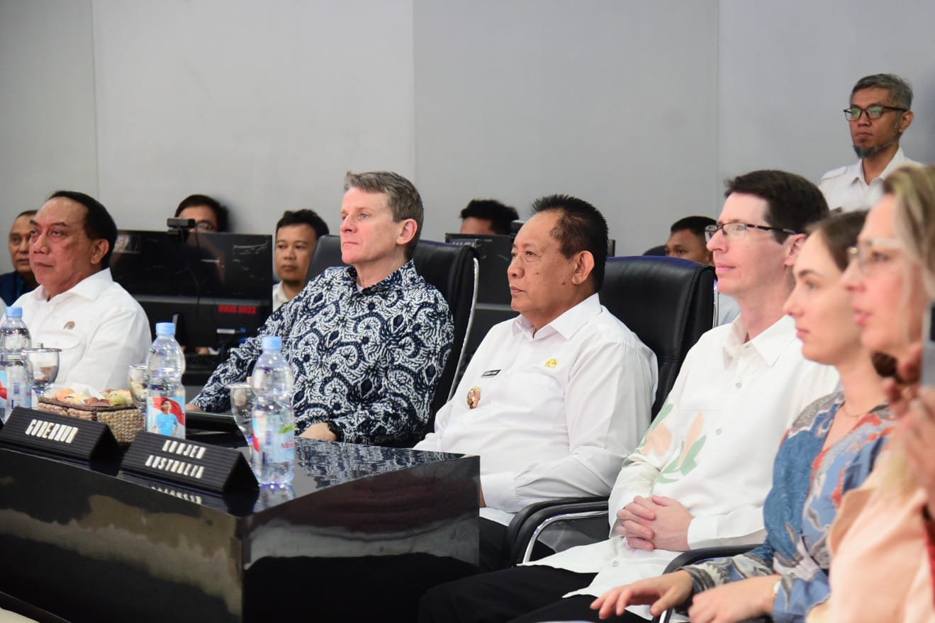 Gubernur Gusnar Ismail bersama Dubes Australia Mr. Rod Brazier menyaksikan paparan data oleh Kepala Dinas Kominfotik di ruangan Command Center Gubernuran Gorontalo, Rabu (22/10/2025). (Foto : Haris)