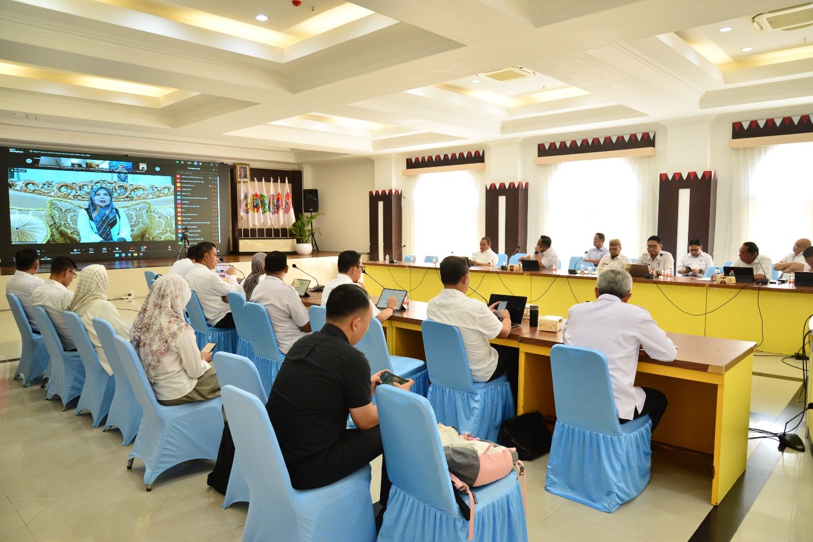 Pelaksanaan Rapat Pimpinan yang digelar secara virtual melalui zoom meeting, Rabu (15/4/2025). Rapat dipimpin Gubernur Gusnar Ismail. (Foto : Mila)