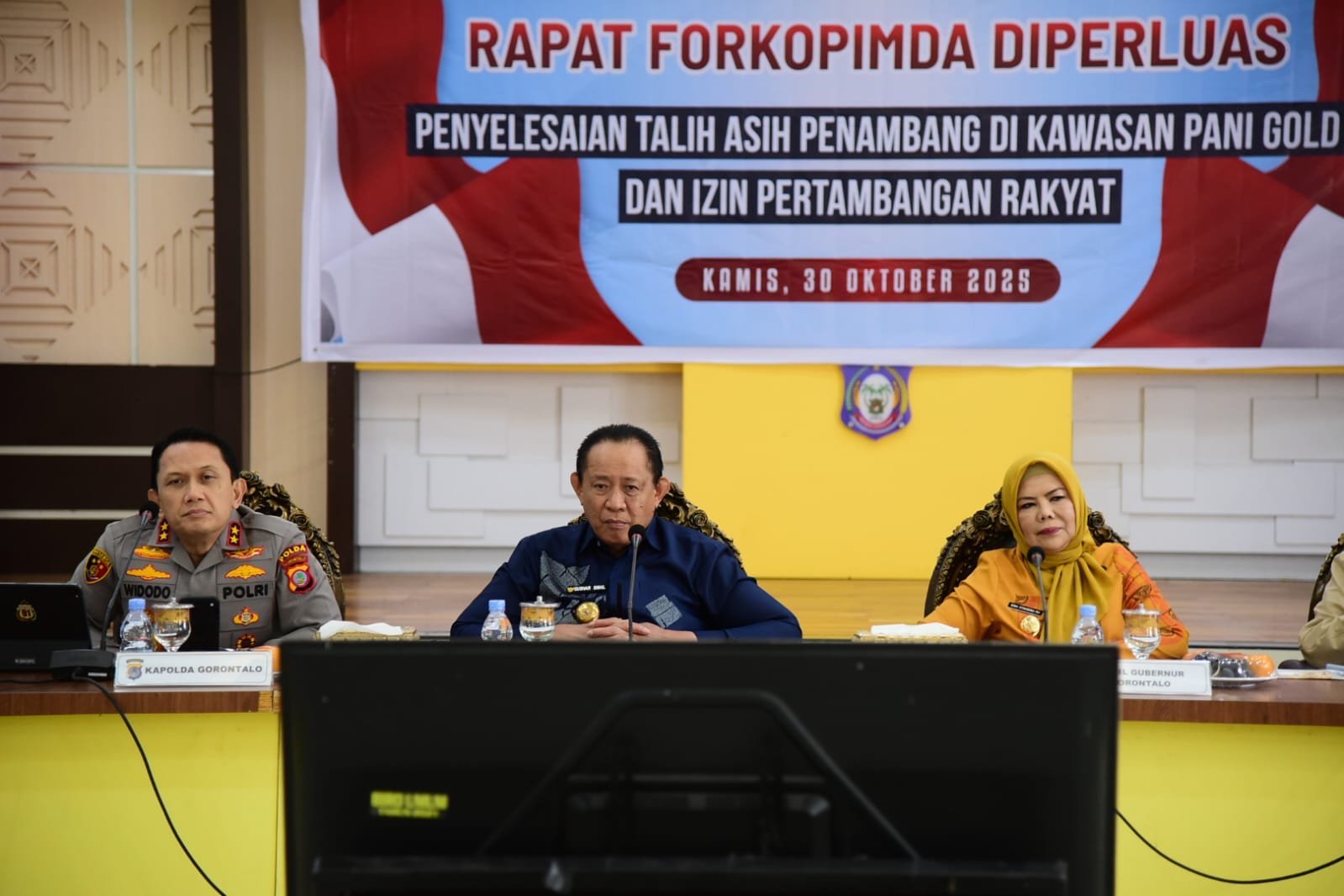 Kota Gorontalo, Kominfotik — Forum Koordinasi Pimpinan Daerah (Forkopimda) Provinsi Gorontalo menggelar rapat diperluas, Kamis (30/10/2025), membahas dua agenda penting yakni penyelesaian tali asih penambang di wilayah Pani Gold dan pembentukan Izin Pertambangan Rakyat (IPR).