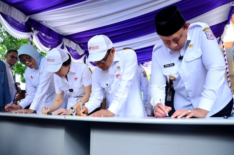 Gubernur Gorontalo Gusnar Ismail (kanan) mendampingi Menko Pemberdayaan Masyarakat Muhaimin Iskandar dan Wamen PPPA Veronica Tan pada pengenalan Sekolah Garuda Transformasi di MAN Insan Cendekia, Kabupaten Bone Bolango, Rabu (8/10/2025). (Foto : Rian)
