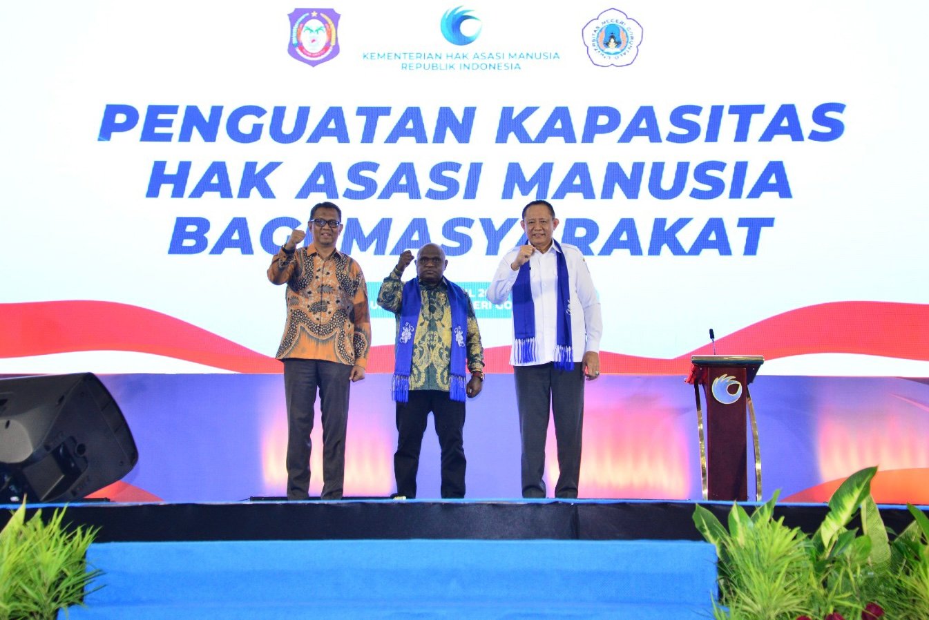 Foto bersama Gubernur Gusnar Ismail dan Menteri Hak Asasi Manusia (Menhan) Natalius Pigai pada Penguatan Kapasitas HAM Bagi 5000 Masyarakat di Auditorium Universitas Negeri Gorontalo, Rabu (1/4/2026). (Foto : Mila)