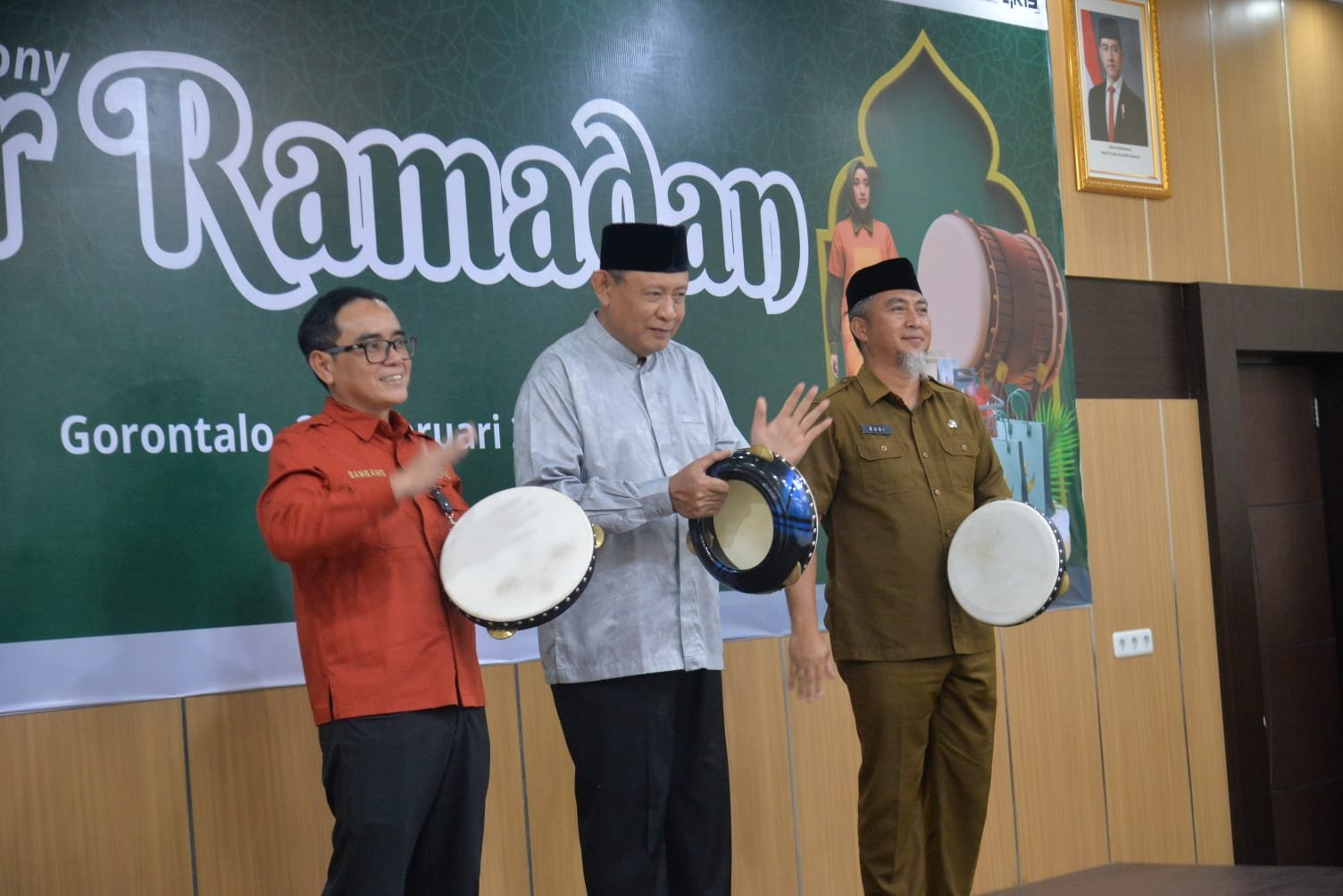 Gubernur Gorontalo Gusnar Ismail bersama Kepala Perwakilan BI Provinsi Gorontalo, Bambang Satya Permana, serta Direktur Eksekutif KDEKS Provinsi Gorontalo, Budiyanto Sidiki saat menabuh rebana tanda dibukanya pelaksanaan Bazar Ramadan tahun 2026 di gedung galeri UMKM Olaku, Senin (23/2/2026). (Foto : Bahrian)