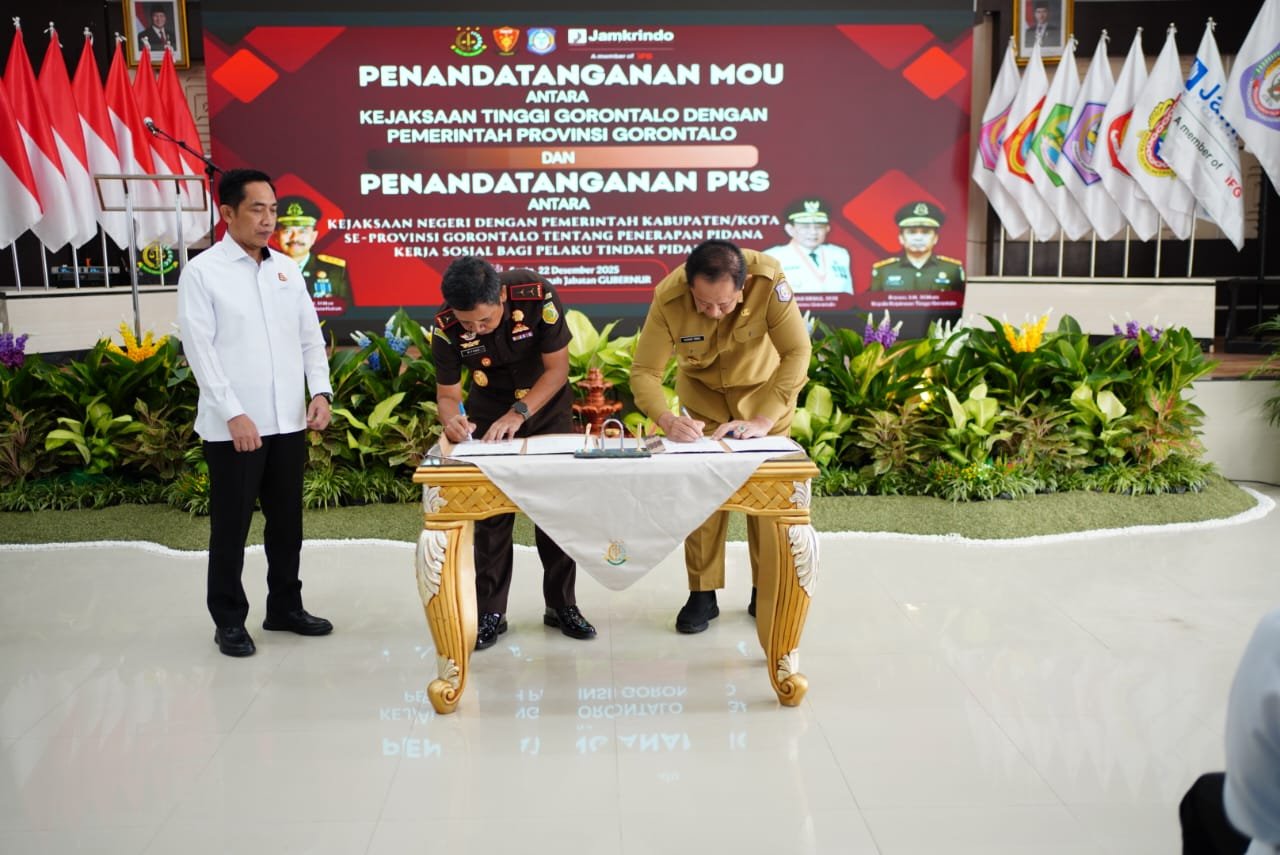 Kota Gorontalo, Kominfotik — Gubernur Gorontalo Gusnar Ismail, menyatakan dukungan penuh terhadap penerapan Pidana Kerja Sosial yang direncanakan mulai diberlakukan pada tahun 2026. Dukungan tersebut disampaikan dalam kegiatan penandatanganan Nota Kesepahaman (MoU) antara Pemerintah Daerah, Kejaksaan, dan Jamkrindo. Penandatanganan MoU tersebut berlangsung di Aula Rumah Jabatan Gubernur Gorontalo, Senin (22/12/2025).