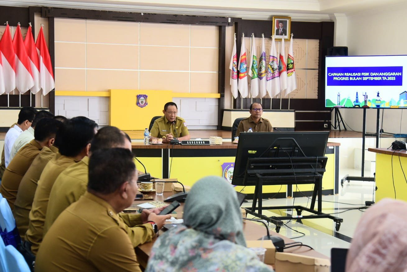 Gubernur Gusnar Ismail memimpin rapat evaluasi penyerapan anggaran di aula rumah jabatan gubernur, Selasa (7/10/2025). (Foto : Haris)