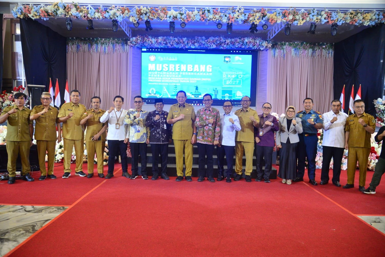 Foto bersama pada kegiatan Musyawarah Perencanaan Pembangunan Daerah (Musrenbangda) Tahun 2027 di Hulonthalo Ballroom, Selasa (14/4/2026). (Foto : Bahrian)