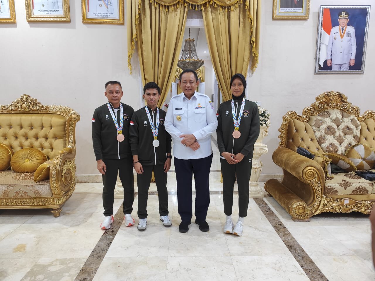Gubernur Gorontalo Gusnar Ismail bersama dua atlet Gorontalo san satu pelatih yang mengharumkan nama Indonesia pada ajang Sea Games 2025 di Thailand. (Foto – Ryan Diskominfotik).
