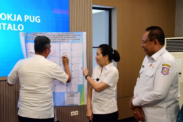Gubernur Gusnar Ismail bersama Wamen PPPA Veronica Tan menyaksikan penandatanganan komitmen pelaksanaan PUG oleh pimpinan OPD Provinsi Gorontalo di Hulonthalo Ballroom, Kota Gorontalo, Rabu (8/10/2025). (Foto : Haris)