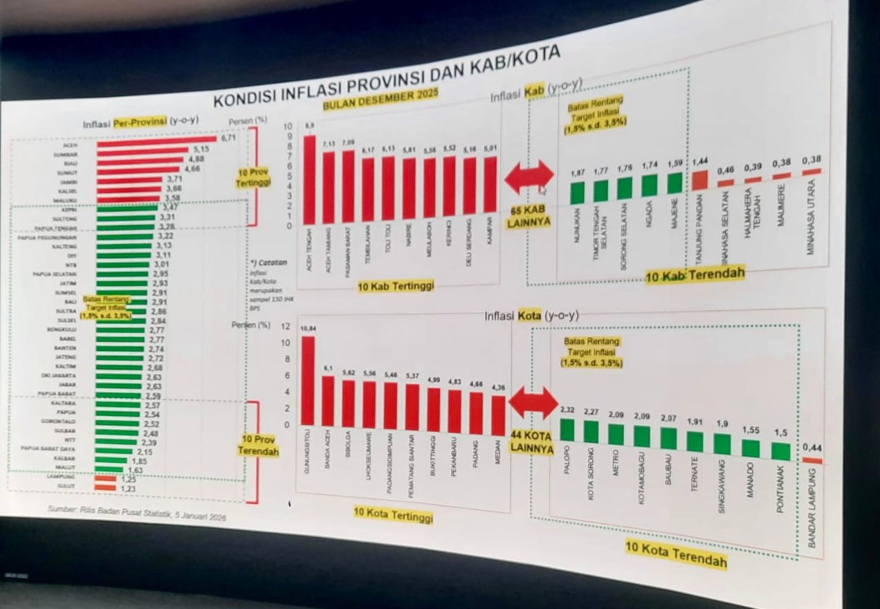 Secara kewilayahan, inflasi di Provinsi Gorontalo dipicu oleh pergerakan harga di dua daerah pantauan utama. Kota Gorontalo mencatat inflasi bulanan 0,73 persen (2,50% yoy), sementara Kabupaten Gorontalo mencatat 0,99 persen (2,54% yoy).
