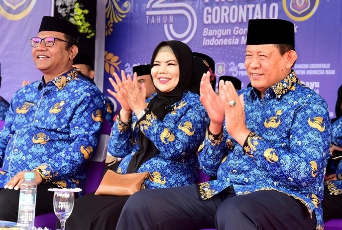 Gubernur Gorontalo Gusnar Ismail, Wagub Idah Syahidah Rusli Habibie, dan Sekda Sofian Ibrahim menghadiri apel Korpri di Museum Purbakala. (Foto : Haris)