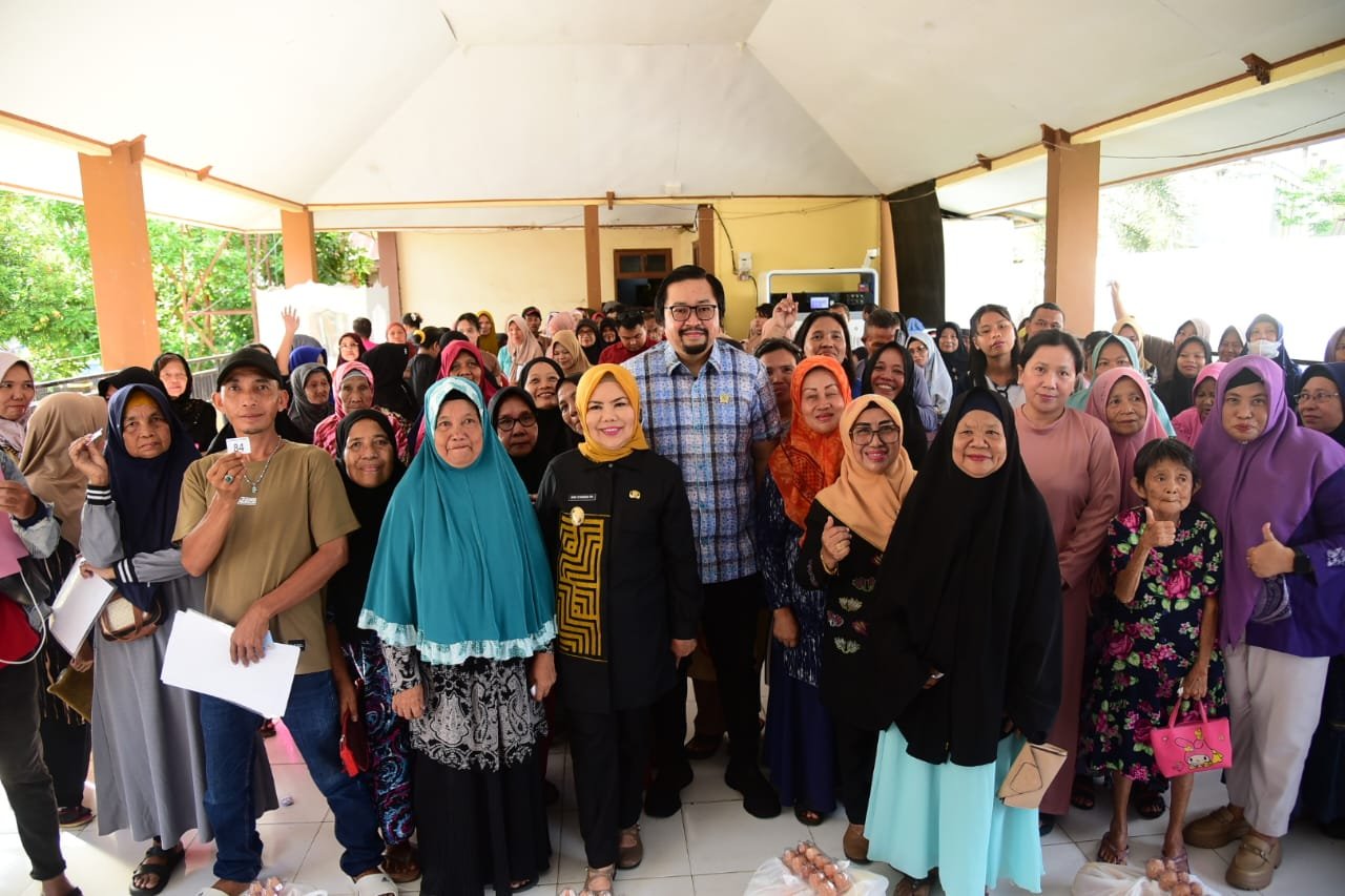 Wakil Gubernur Gorontalo Idah Syahidah Rusli Habibie didampingi Anggota DPRD Provinsi Gorontalo Erwin Ismail bersama masyarakat Kota Selatan penerima bantuan rawan pangan di Kota Gorontalo, Kamis, (4/12/2025). Foto – Nova Diskominfotik.