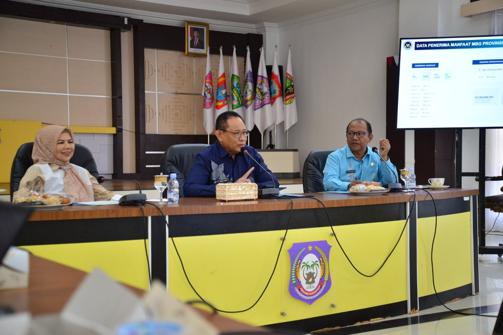 Gubernur Gorontalo Gusnar Ismail saat memimpin rapat evaluasi MBG, di Aula Rujab Gubernur, Kamis (6/11/2025).  Turut hadir Wagub Idah Syahidah Rusli Habibie dan Sekdaprov Sofian Ibrahim. (Foto : Mila)
