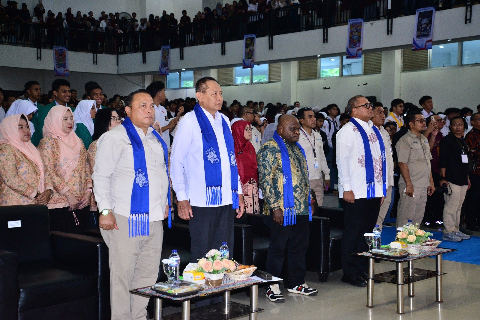 Gubernur Gusnar Ismail,Menteri Hak Asasi Manusia (Menham) Natalius Pigai, dan Rektor Universitas Negeri Gorontalo Eduart Wolok saat menghadiri Penguatan Kapasitas HAM bagi 5000 Masyarakat di Auditorium UNG, Rabu (1/4/2026). (Foto : Mila)