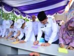Gubernur Gorontalo Gusnar Ismail bersama Menko PM Muhaimin Iskandar dan Wamen PPPA Veronica Tan saat menulis harapan pada pengenalan sekolah Garuda transformasi