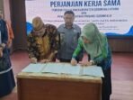 Penandatanganan perjanjian kerja sama (PKS) dalam pemanfaatan aplikasi satu data antara Kepala Dinas Kominfo dan Statistik (Diskominfotik) Provinsi Gorontalo Sri Wahyuni D.