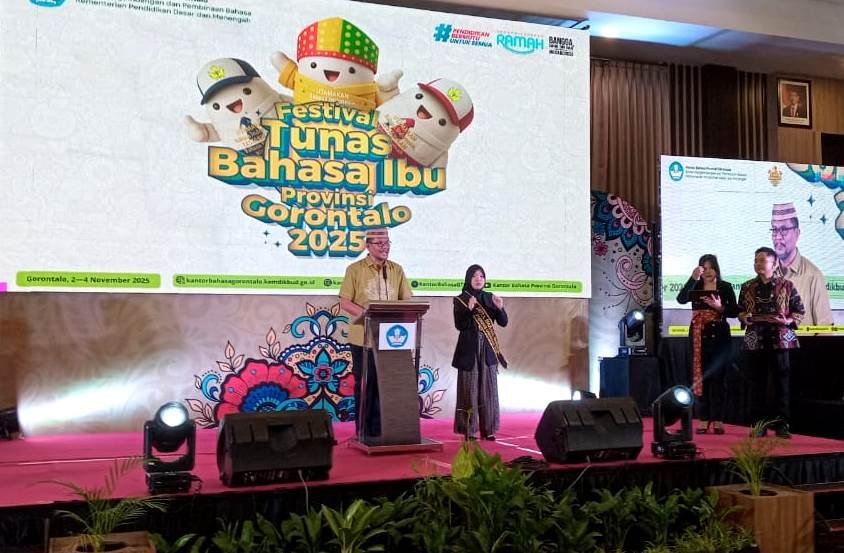 KOTA GORONTALO, Kominfotik – Gubernur Gorontalo yang diwakili Staf Ahli Bidang Pemerintahan, Hukum, dan Politik, Masran Rauf, mendorong pelestarian bahasa daerah di kalangan generasi muda. Hal itu disampaikannya pada puncak kegiatan Festival Tunas Bahasa Ibu (FTBI) Tahun 2025 yang digelar oleh Kantor Bahasa Provinsi Gorontalo di Hotel Aston, Kota Gorontalo, Minggu (2/11/2025).