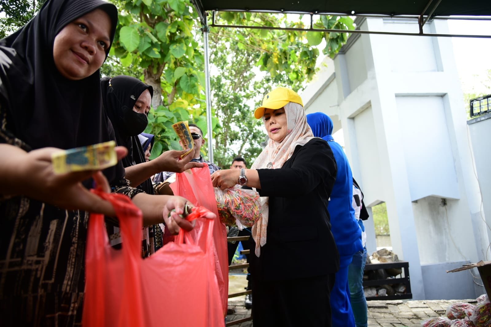 Wakil Gubernur Gorontalo Idah Syahidah Rusli Habibie saat melayani masyarakat berbelanja di Pasar Murah Bersubsidi yang dilaksanakan di Lapangan Mako Lanal Gorontalo, Kelurahan Leato Selatan, Kecamatan Dumbo Raya, Kota Gorontalo, Senin (16/3/2026). Foto – Nova Diskominfotik.