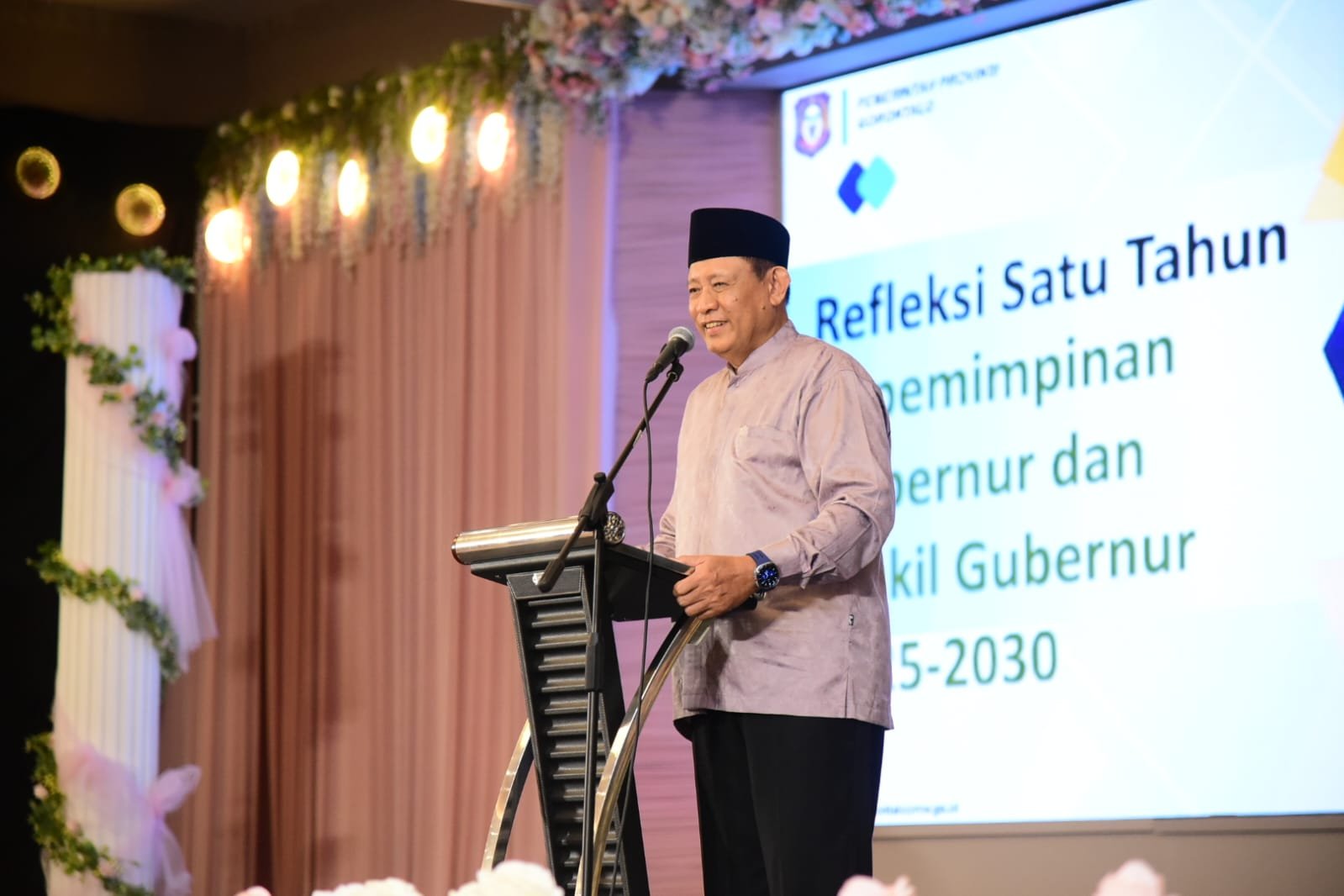 Gubernur Gorontalo Gusnar Ismail saat memaparkan pencapaian kepemimpinan bersama Wagub Idah Syahidah Rusli Habibie pada kegiatan refleksi satu tahun yang dirangkaikan dengan buka puasa bersama di Hulondalo Ballroom, Kota Gorontalo, Selasa (24/2/2025). (Foto : Nova)