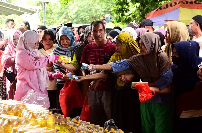 Warga mengatre membeli minyak goreng pada pasar murah bersubsidi yang digelar Pemerintah Provinsi Gorontalo di halaman Masjid As-Salam, Kelurahan Ipilo, Kecamatan Kota Timur, Kota Gorontalo, Selasa (9/12/2025). (Foto : Haris)
