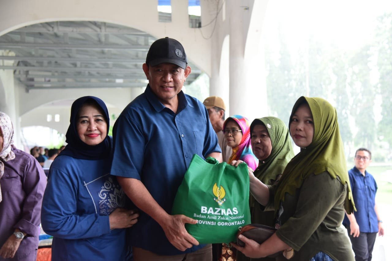 Gubernur Gorontalo Gusnar Ismail bersama Ketua TP-PKK Nani Ismail Mokodongan saat menyerahkan bantuan sembako dari Baznas kepada masyarakat di Tilamuta, Kabupaten Boalemo. (Foto- Fadly Diskominfotik).