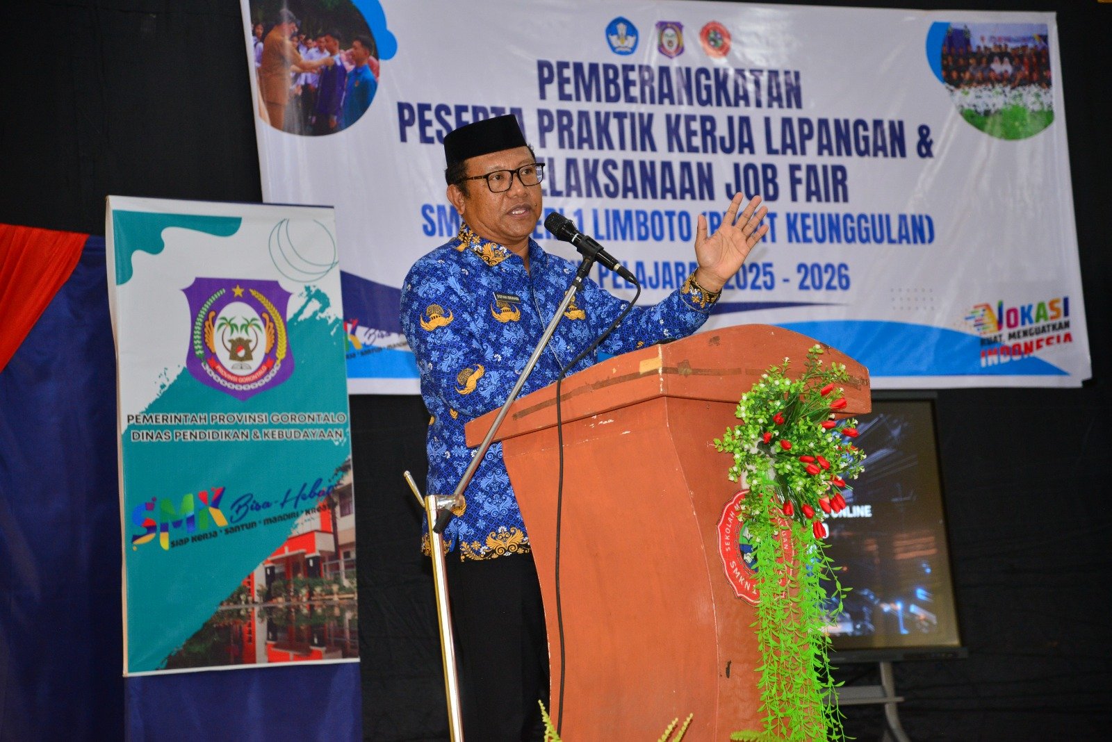 Kab. Gorontalo, Kominfotik – Sekretaris Daerah Provinsi Gorontalo Sofian Ibrahim, melepas 279 siswa SMK Negeri 1 Limboto untuk mengikuti Praktik Kerja Lapangan (PKL) yang tersebar di berbagai perusahaan, kegiatan ini berlangsung di aula SMK Negeri 1 Limboto Senin (1/12/2025). Kegiatan ini dirangkaikan dengan Job Fair yang mempertemukan dunia usaha dengan para alumni SMK.