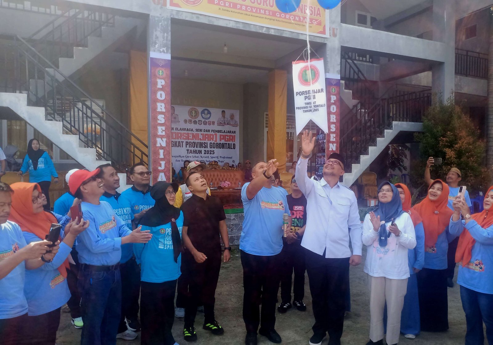 Pembukaan Porsenijar PGRI Tingkat Provinsi Gorontalo yang ditandai dengan pelepasan balon oleh Staf Ahli Gubernur Gorontalo, Masran Rauf, di halaman Gedung Guru Provinsi Gorontalo, Rabu (8/10/2025). (Foto : Istimewa)