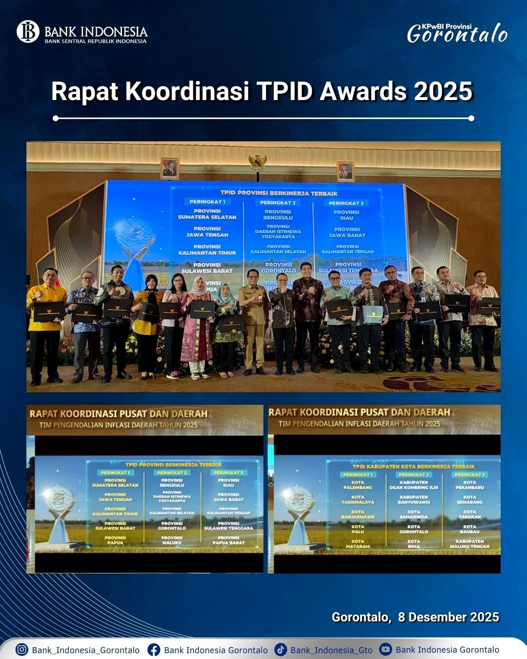 Keberhasil Provinsi Gorontalo meraih TPID Awards 2025 tak lepas dari tingkat inflasi yang selalu terjaga dan terkendali sepanjang tahun 2025. Bahkan dalam penilaian Kemendagri yang secara rutin setiap pekan memonitor perkembangan inflasi daerah, Gorontalo beberapa kali masuk dalam daerah dengan tingkat inflasi terbaik secara nasional.