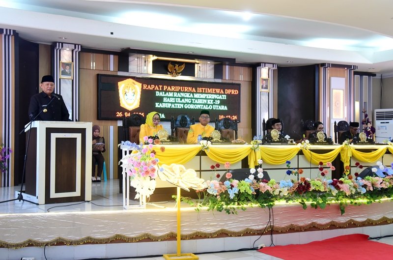 Gubernur Gorontalo Gusnar Ismail saat memberikan sambutan pada Rapat Paripurna Istimewa DPRD dalam rangka HUT ke-19 Gorontalo Utara, (26/4/2025). (Foto : Haris)