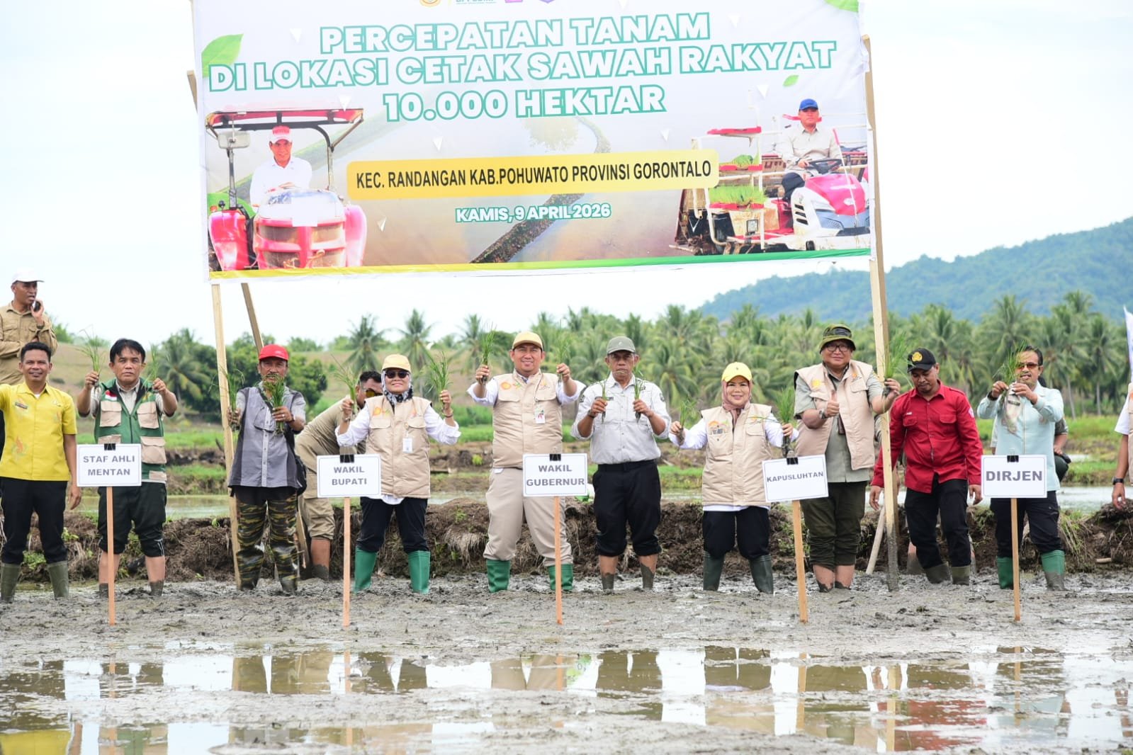 Gorontalo Vice Governor Idah Syahidah Rusli Habibie, Head of the Center for Agricultural Extension and Human Resource Development (BPPSDMP) of the Indonesian Ministry of Agriculture Eko Nugroho Putro, and other stakeholders participated in the simultaneous rice planting event at the 10,000-hectare People’s Rice Field Development (CSR) site in Motolohu Selatan Village, Randangan District, Pohuwato Regency, Thursday (April 9, 2026). (Photo: Nova/Diskominfotik)