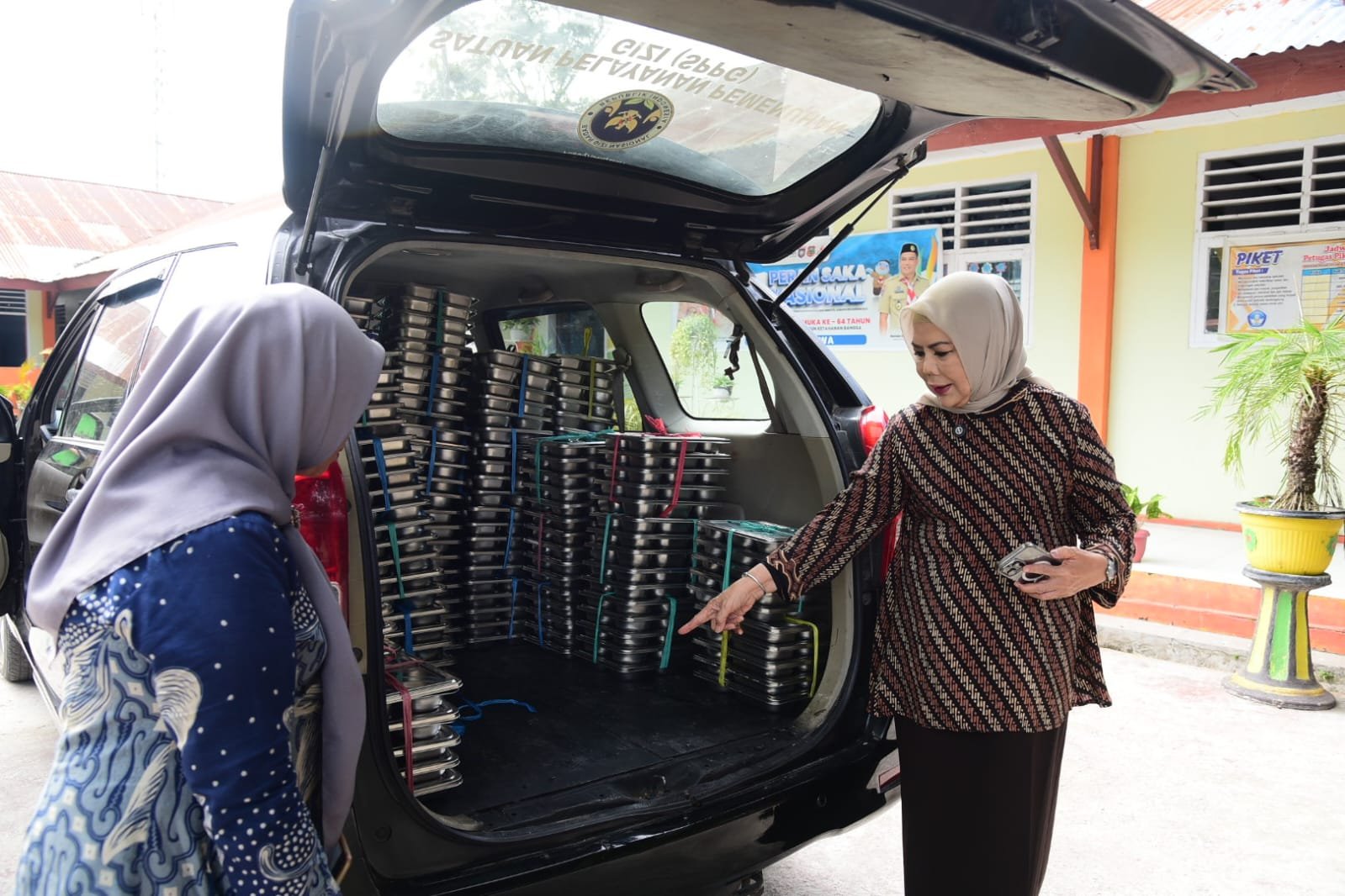 The MBG distribution vehicle at SDN 6 Tibawa, which Gorontalo Vice Governor Idah Syahidah Rusli Habibie noted did not comply with SOP. Photo – Nova Diskominfotik.)