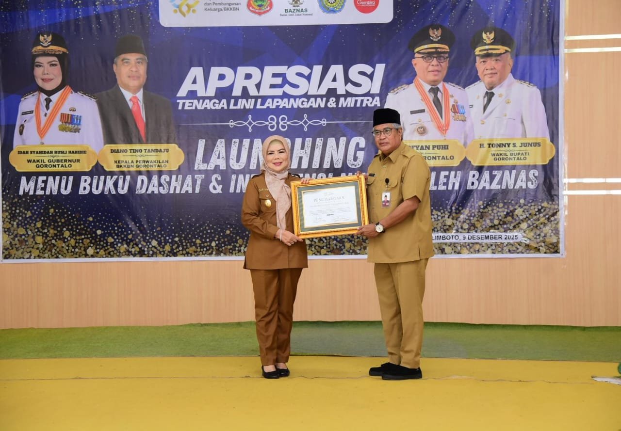 Kabupaten Gorontalo, Kominfotik – Wakil Gubernur Gorontalo Idah Syahidah Rusli Habibie, menerima penghargaan sebagai Bunda Akselerasi Penurunan Stunting dari Badan Kependudukan dan Keluarga Berencana Nasional (BKKBN) RI. Penghargaan tersebut diserahkan oleh Kepala BKKBN Provinsi Gorontalo Diano Tino Tandaju, pada kegiatan peluncuran buku DASHAT (Dapur Sehat Atasi Stunting) di Gedung Dikbud Kabupaten Gorontalo, Selasa (9/12/2025).